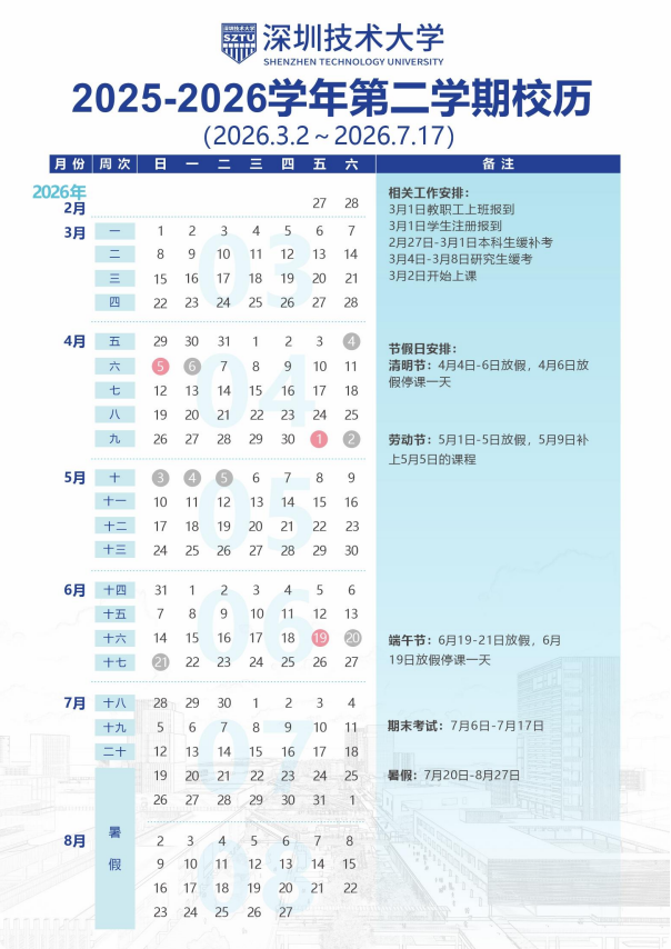 各单位:为保证学校顺利开展各项教学工作,根据教学计划和培养方案,现公布我校2025-2026学年第二学期校历及上课时间,请各单位遵照执行。教务部 2025年12月30